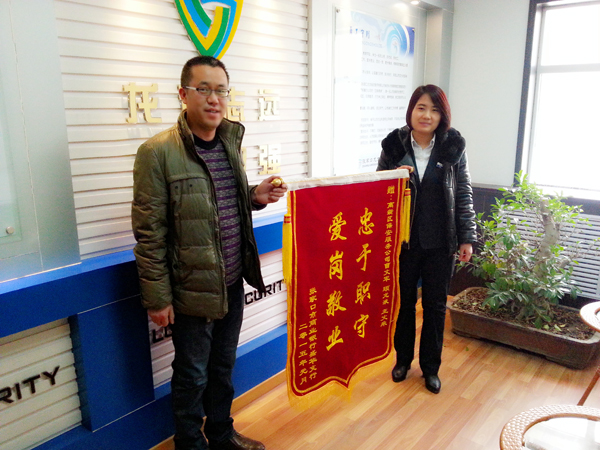 2015年1月份,一位八十多歲高齡的老人到張家口市商業(yè)銀行某支行辦理取錢業(yè)務(wù)時(shí),因老人年事已高患有老年病,與銀行的工作人員發(fā)生了沖突,無(wú)論工作人員如何解釋,仍無(wú)法溝通,至此,老人經(jīng)常到該行找工作人員滋事,老人的行為嚴(yán)重影響到支行的正常業(yè)務(wù),為客戶辦理業(yè)務(wù)帶來(lái)了不便,為維護(hù)好銀行正常秩序,我公司派駐支行的保安隊(duì)員顧龍液、王文來(lái),主動(dòng)接近老人進(jìn)行勸阻,交流溝通,問(wèn)寒問(wèn)暖,緩解老人心態(tài)。之后我公司曹文平隊(duì)長(zhǎng)得知此事,也趕到支行協(xié)助處理,幫忙找到了老人的家人,在家人的勸說(shuō)下,老人離開了支行,支行恢復(fù)了正常的工作秩序。經(jīng)過(guò)此事,我公司保安大隊(duì)長(zhǎng)曹文平及派駐到張家口市商業(yè)銀行的保安隊(duì)員顧龍液、王文來(lái)受到了張家口市商業(yè)銀行支行領(lǐng)導(dǎo)的高度贊揚(yáng),特到我公司送來(lái)了錦旗與表?yè)P(yáng)信,對(duì)我公司進(jìn)行感謝。